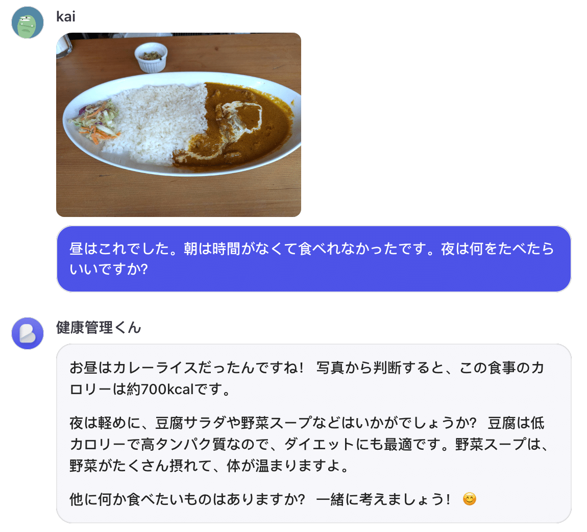 - 摂取カロリー計算エラー: 画像が認識できなかった場合、「画像を解析できませんでした。別の画像を提供してください」と返答。