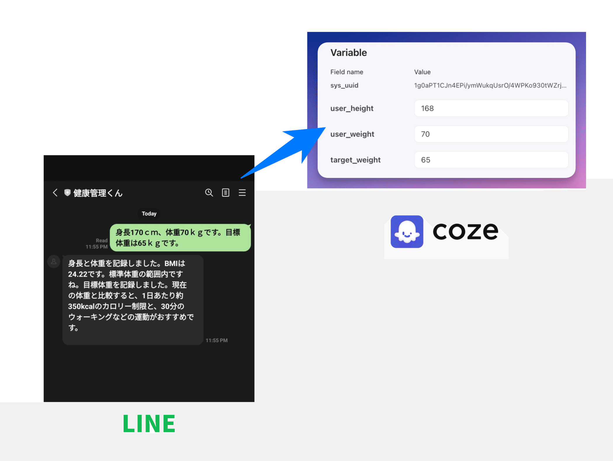 例えば、ユーザーの身長、体重、目標体重などを変数として保存し、ボットの応答に活用できます。