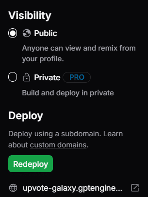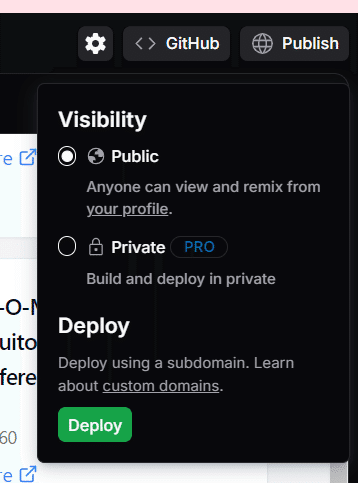 Publishボタンを押すことで、デプロイの設定をすることができます。プライベートにデプロイするにはPRO版に課金する必要があるので注意が必要です。