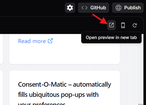 Open preview in new tabから現在開発中のサイトのプレビューを確認することができます。また、その隣のスマートフォンのアイコンからレスポンシブデザインについても確認することができます。
