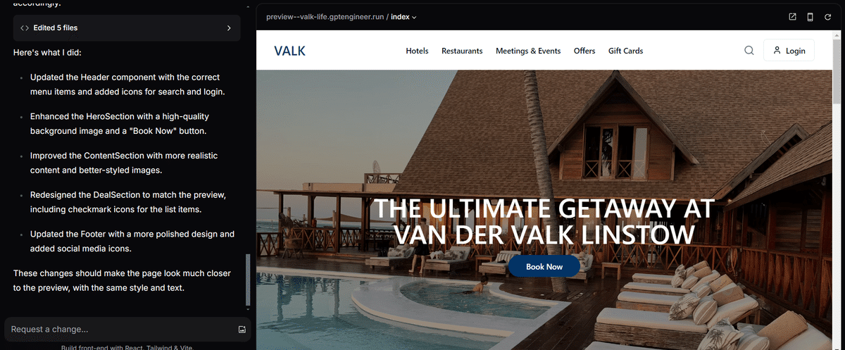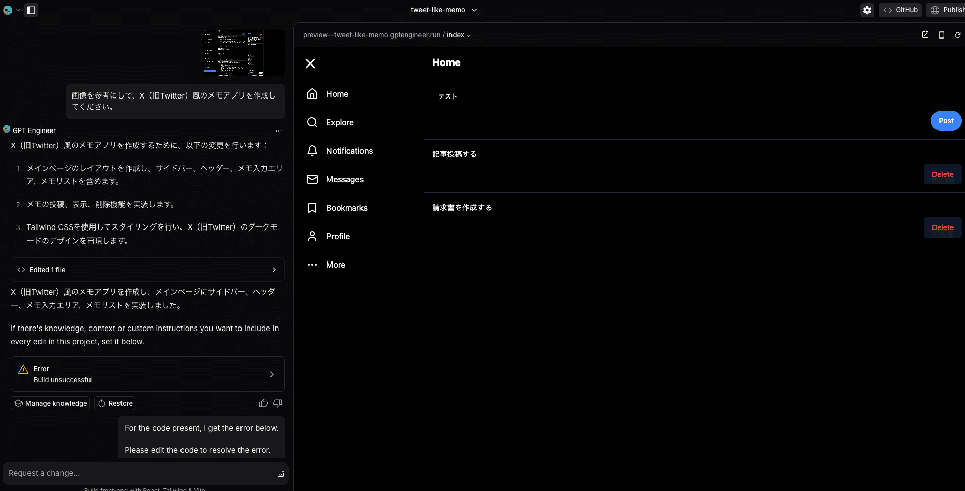 プロンプトを入力すると、GPT Engineer がコードを生成し、右側のプレビュー画面に UI が表示されます。