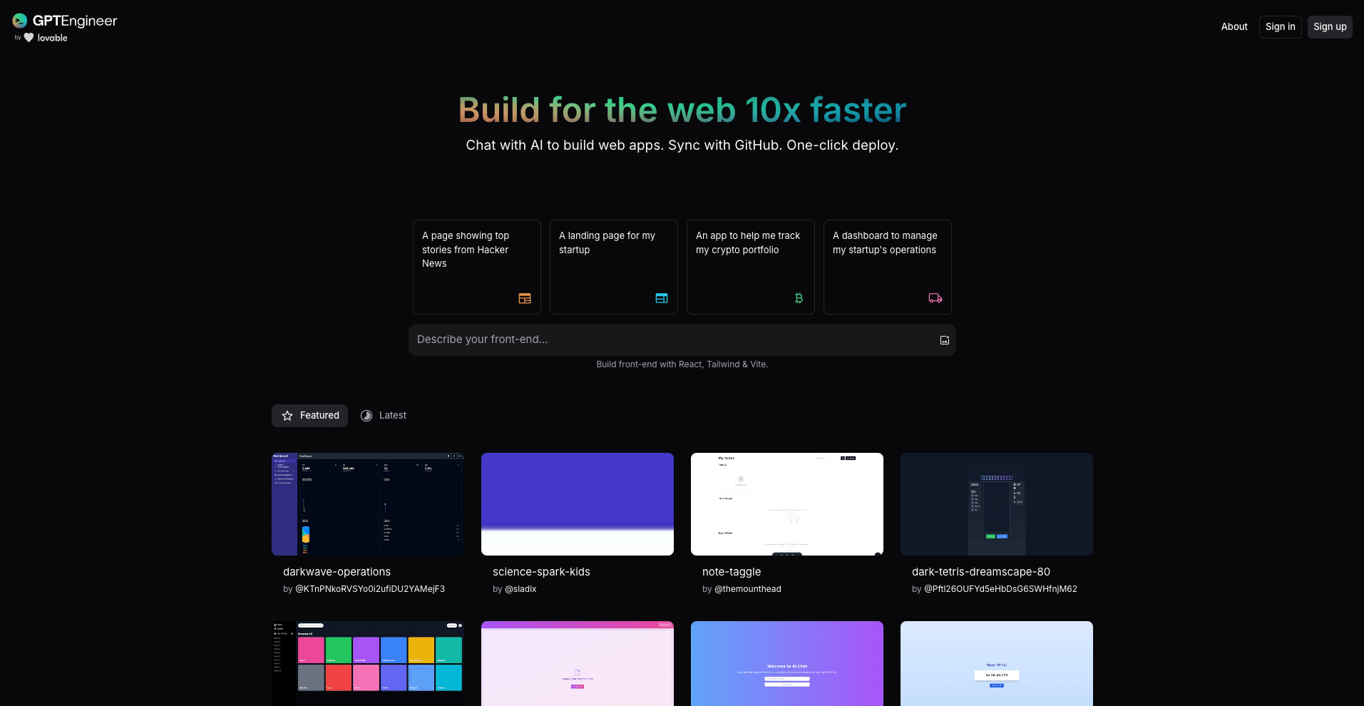 GPT Engineerは、チャット形式でReact、Tailwind CSS、Vite、Shadcn/uiを用いてフロントエンドのコーディングを行います。