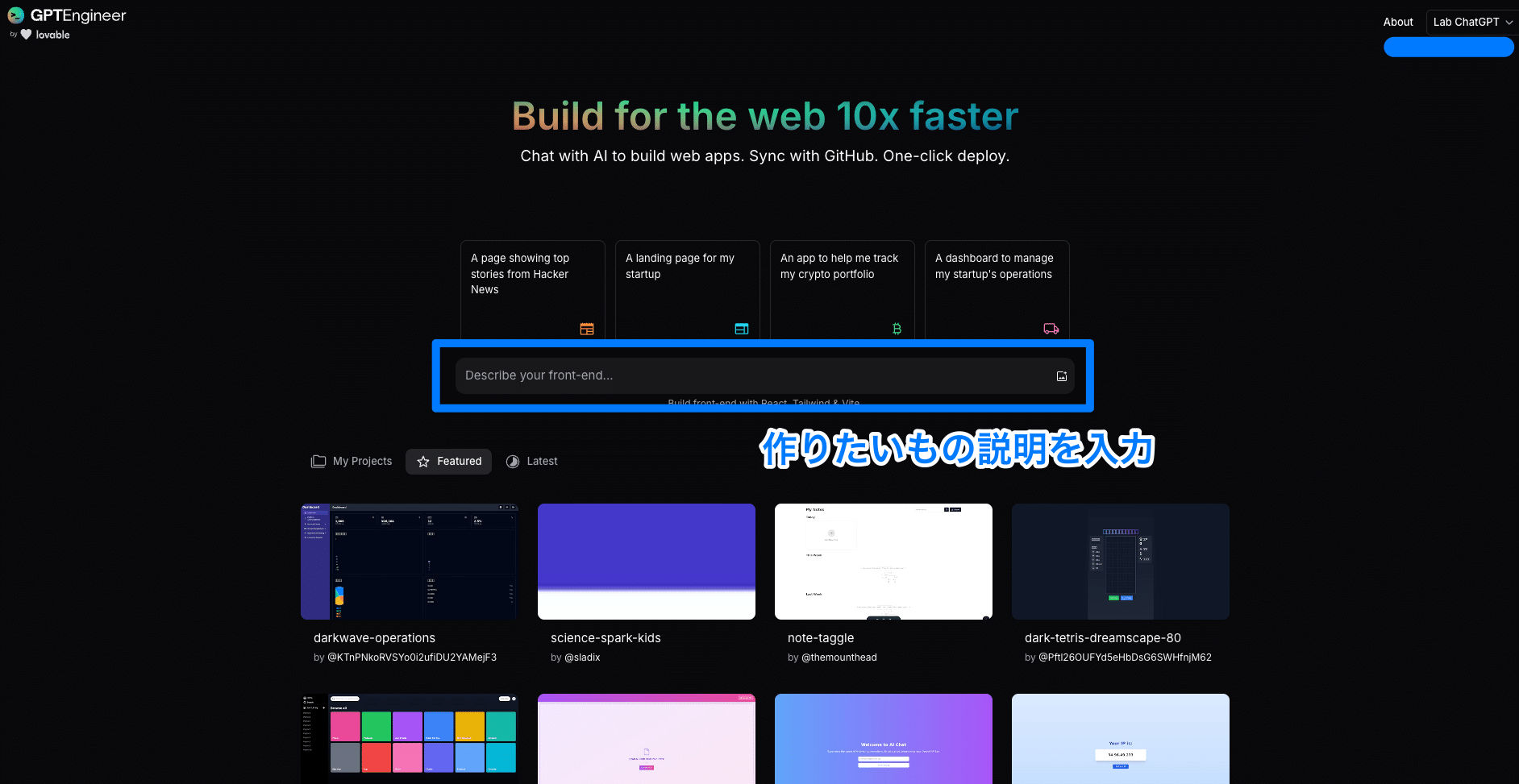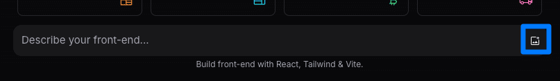 アカウントの作成が完了したら、画面中央の「Describe your front-end...」と書かれた入力欄に、作りたいWebアプリケーションの説明を入力します。