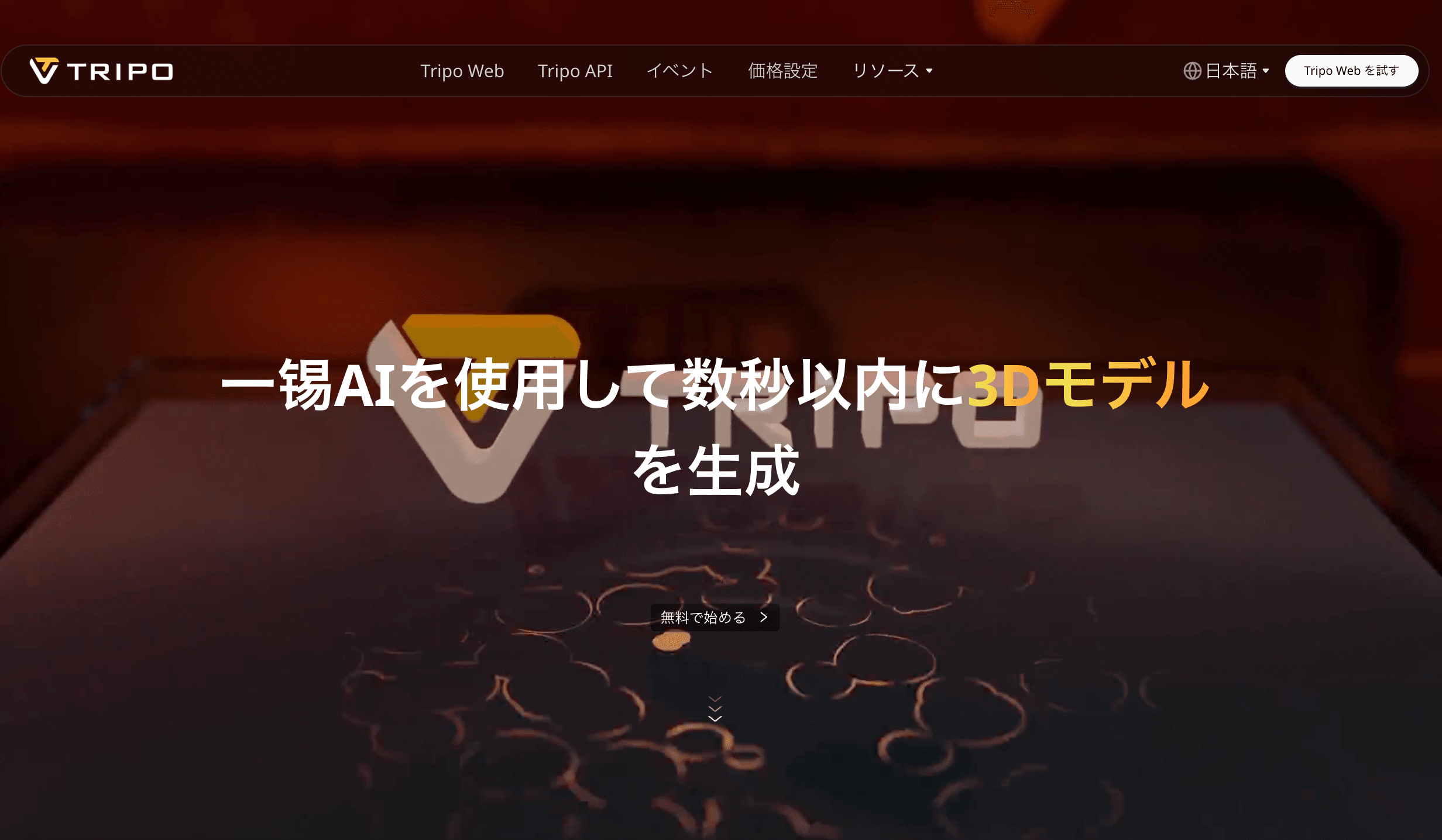 TripoはVAST AI Researchが開発する先進的な3Dモデル生成AIプラットフォームで、ユーザーの入力(文章、画像、手書きのラフスケッチなど)から高品質な3Dモデルを作り出せるのが特徴です。