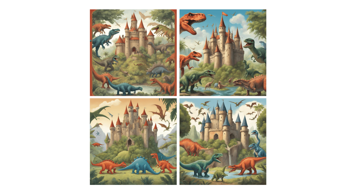 プロンプト:「絵本の表紙風の恐竜に囲まれたお城」