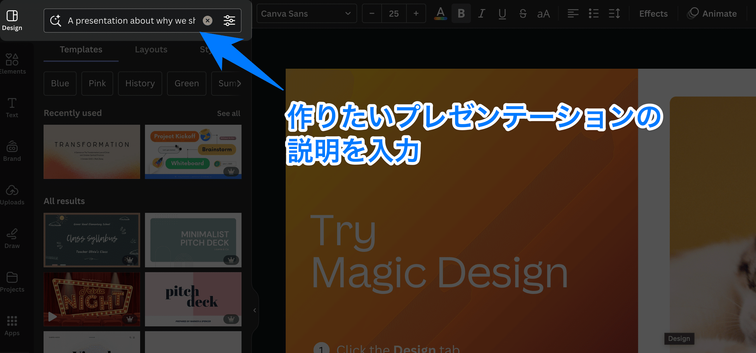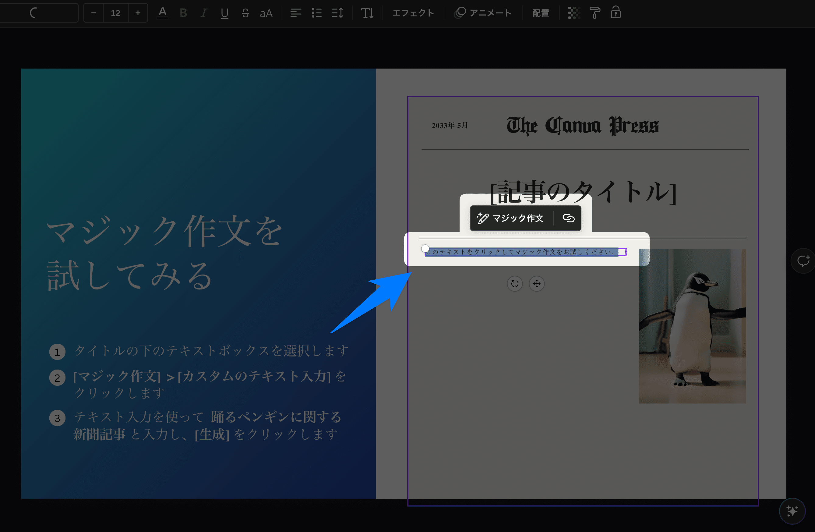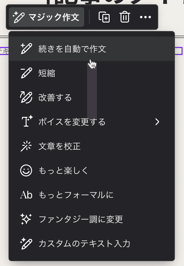 Canvaのマジック作文機能には文章の短縮や校正、さらにカスタムのプロンプトを入力して文章を生成してもらうことができます。