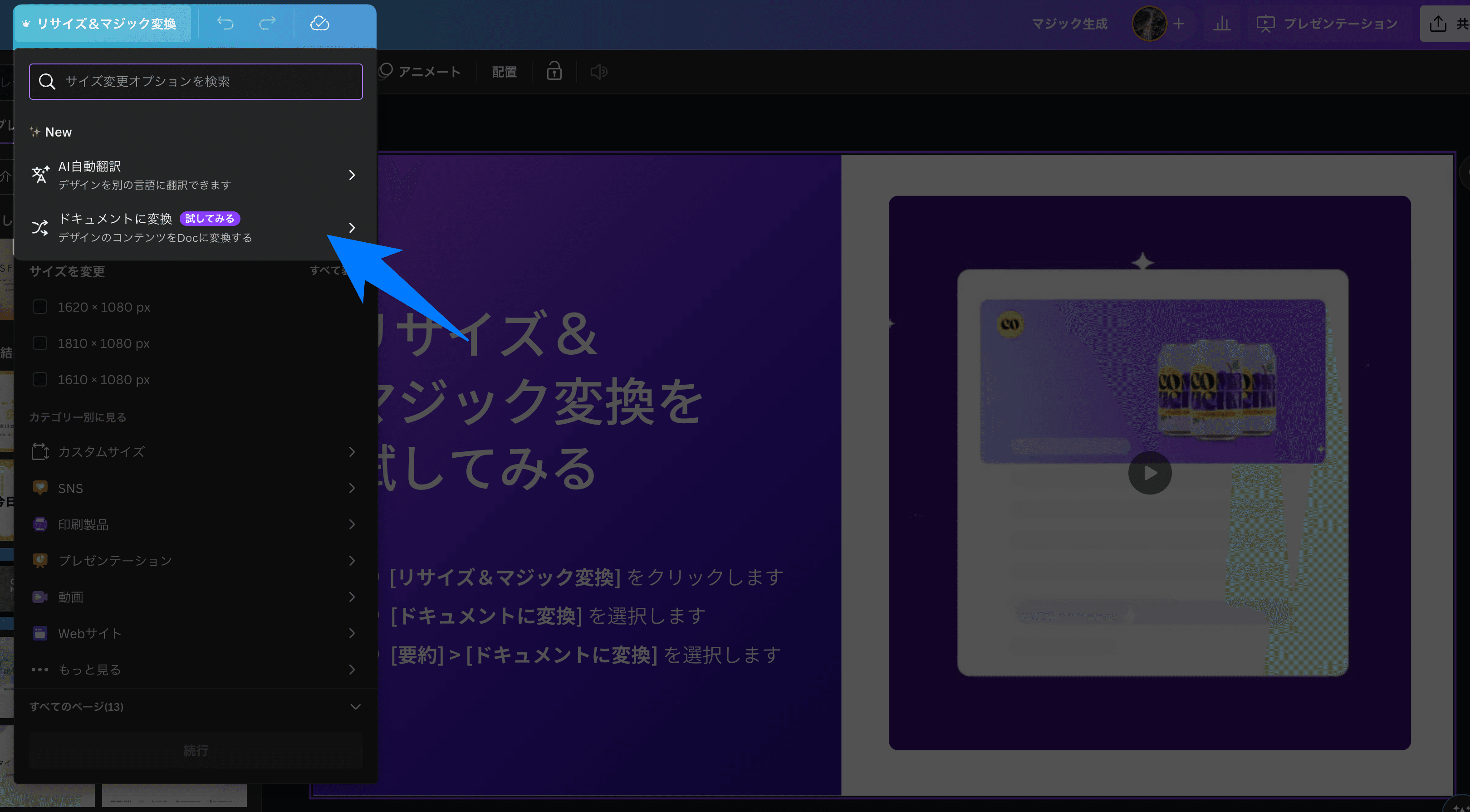 リサイズ&マジック変換:デザインを好きなドキュメント形式に変換します。