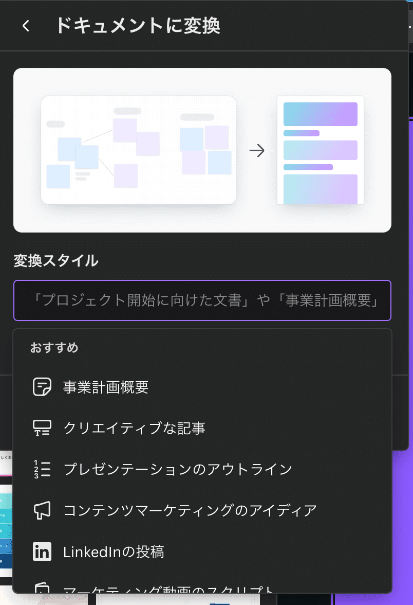 変換するスタイルは「事業計画概要」から「詩」や「歌詞」など多様なスタイルに対応できます。