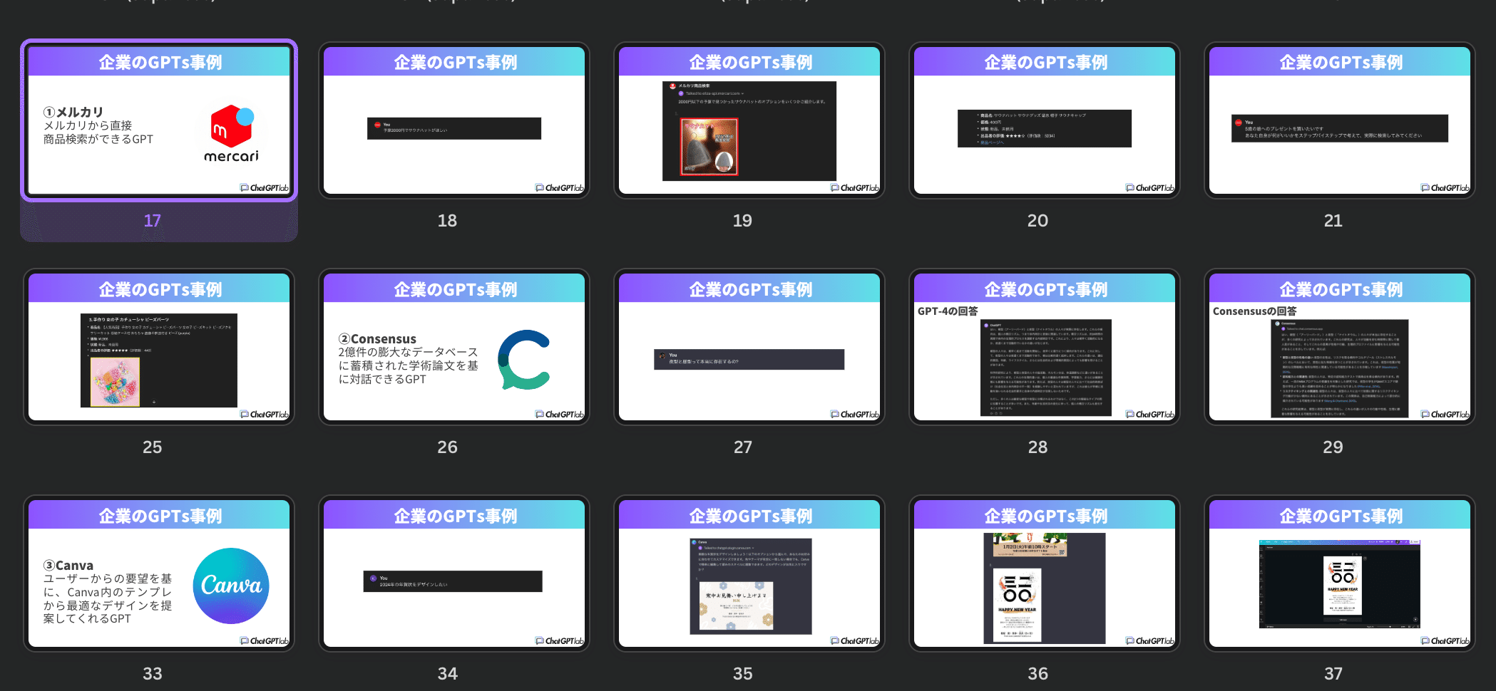先ほどの入力から作成されたプレゼンテーションです。プレゼンテーションは、各7ページ程度のものが2バージョンで作成されます: