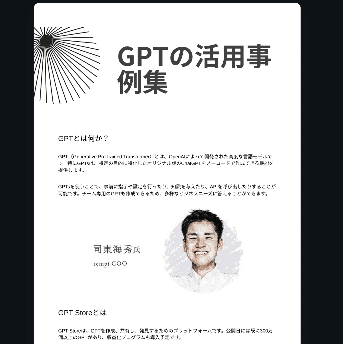 例として、GPTsの活用事例についてまとめたプレゼンテーションを「クリエイティブな記事」に変換してみます。