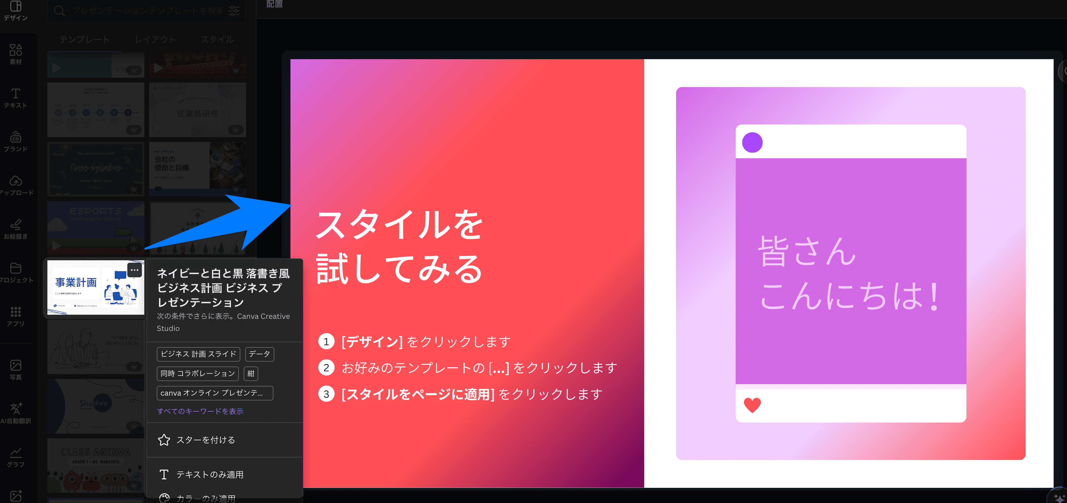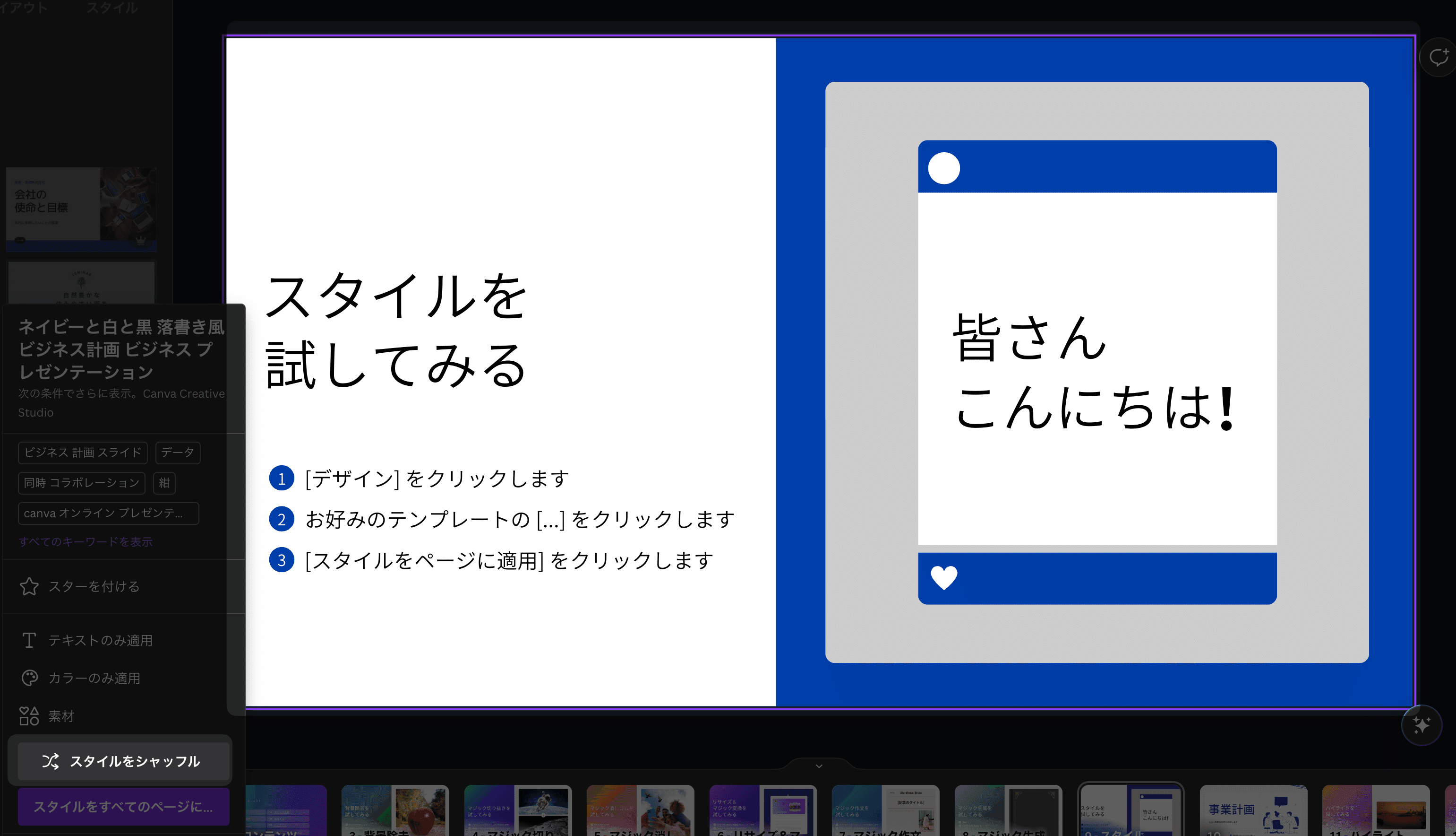 適用後のスタイルが気に入らない場合でも、「スタイルをシャッフル」を選択することで調整できます。また、カラーのみの適用やテキストのみの適用も可能です。