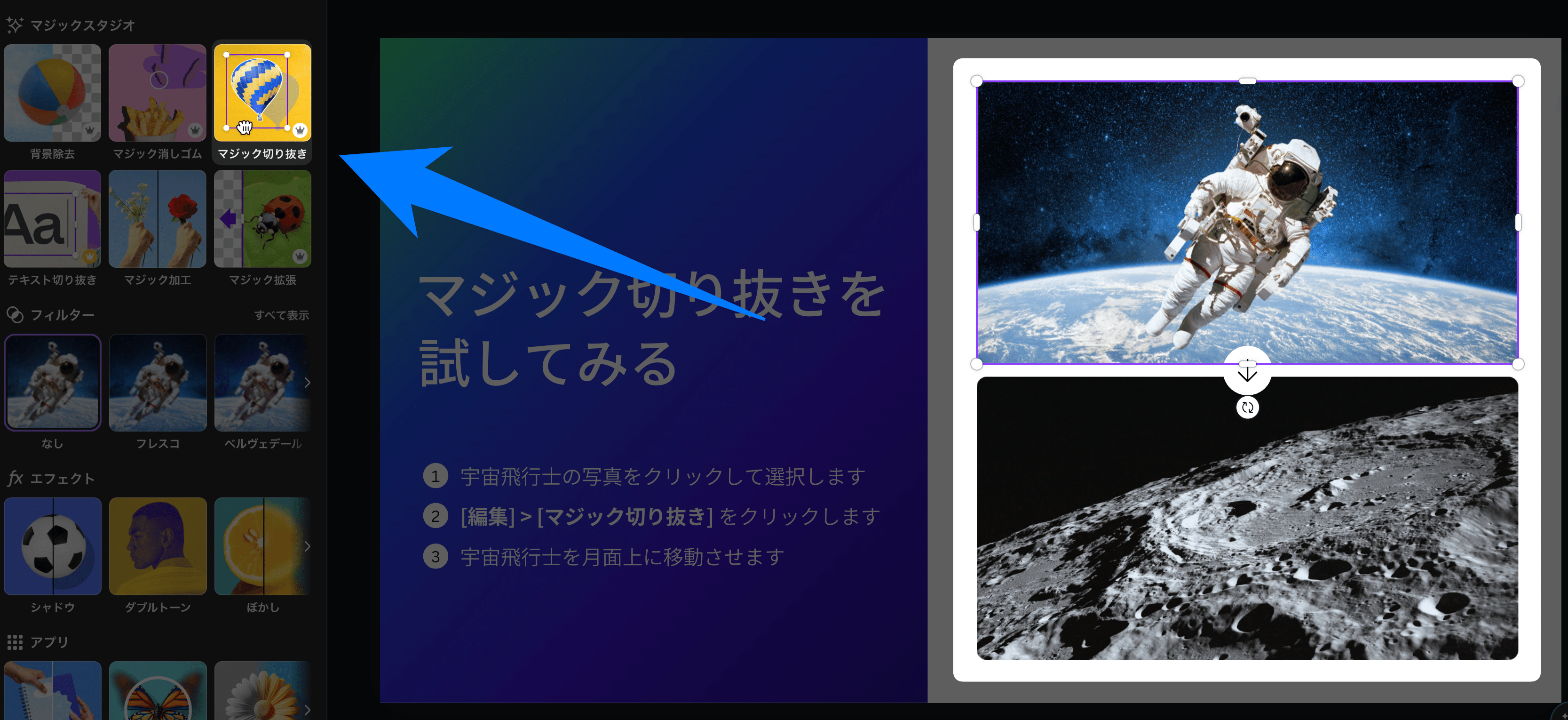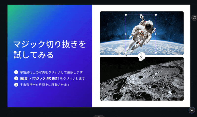 例えば、宇宙飛行士が写っている画像から宇宙飛行士のみを選択し、その下の月面の画像に移動させることができます。