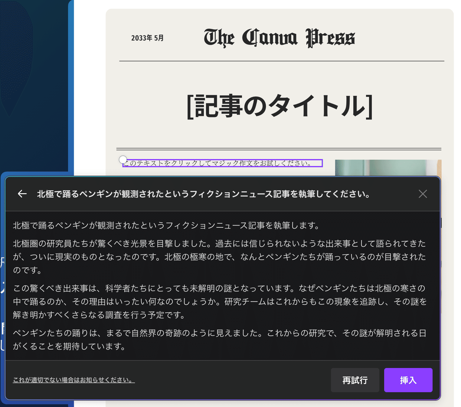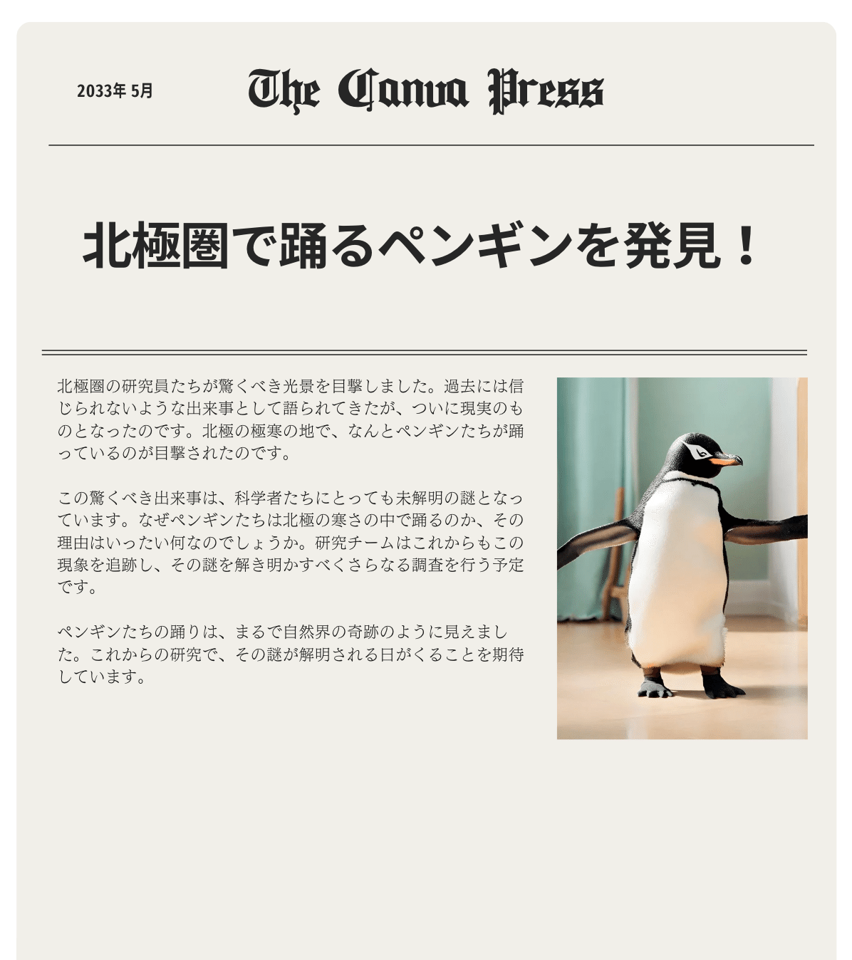 出力:北極で踊るペンギンが観測されたというフィクションニュース記事を執筆します。