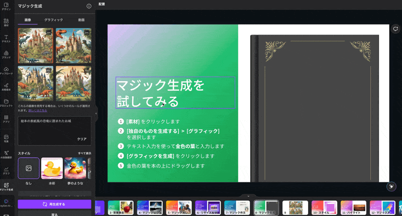 マジックメディア「AI画像生成」:プロンプト(テキスト入力)からグラフィック、アイコン、イラストを生成します。正方形、横長、縦長の画像が生成できます。