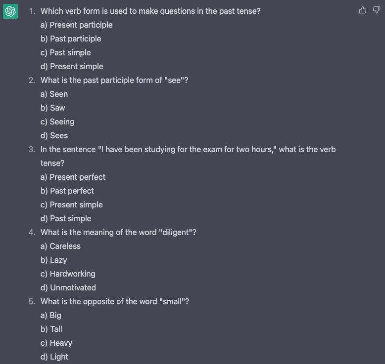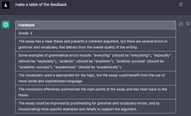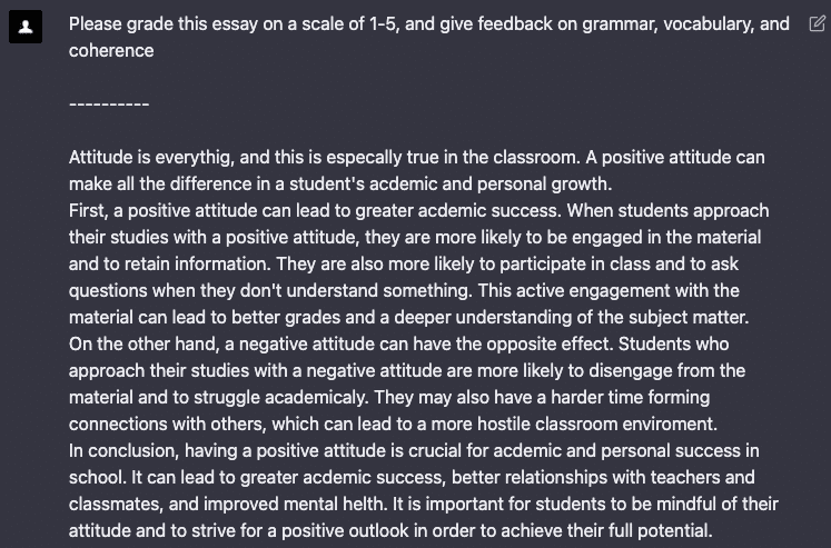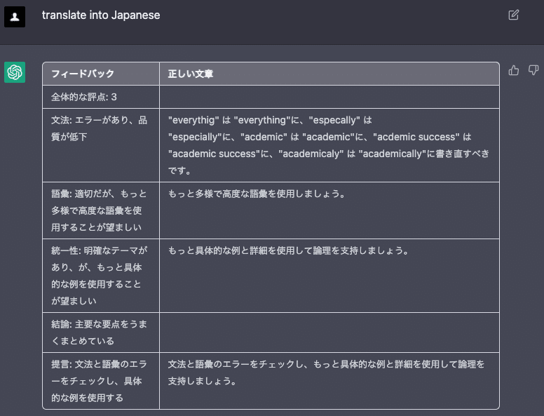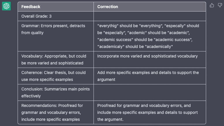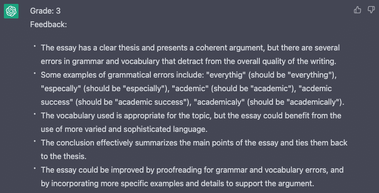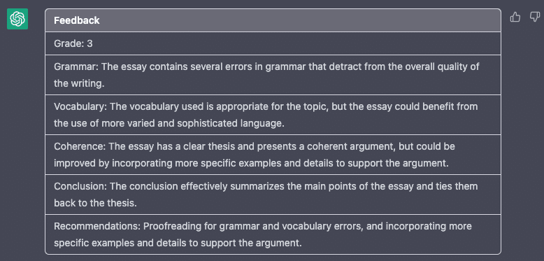 このようにプロンプトを提供することで、ChatGPTはエッセイを分析し、1~5のスケールで採点し、文法、文章構造、語彙、一貫性、改善提案などのフィードバックを提供することができます。これは、家庭教師にとっては、論文の採点にかかる時間を大幅に短縮でき、生徒にとっては、より詳細なフィードバックが得られるため、ライティングスキルの向上に役立つ便利なツールになります。