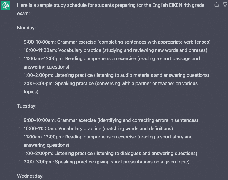 もう一つ、ChatGPTを家庭教師で活用する方法として、例えば英検4級など特定の試験に対する学習スケジュールやカリキュラムの作成をサポートしてもらうことが挙げられます。例えば以下の様なプロンプトでスケジュールやカリキュラムを作成できます。