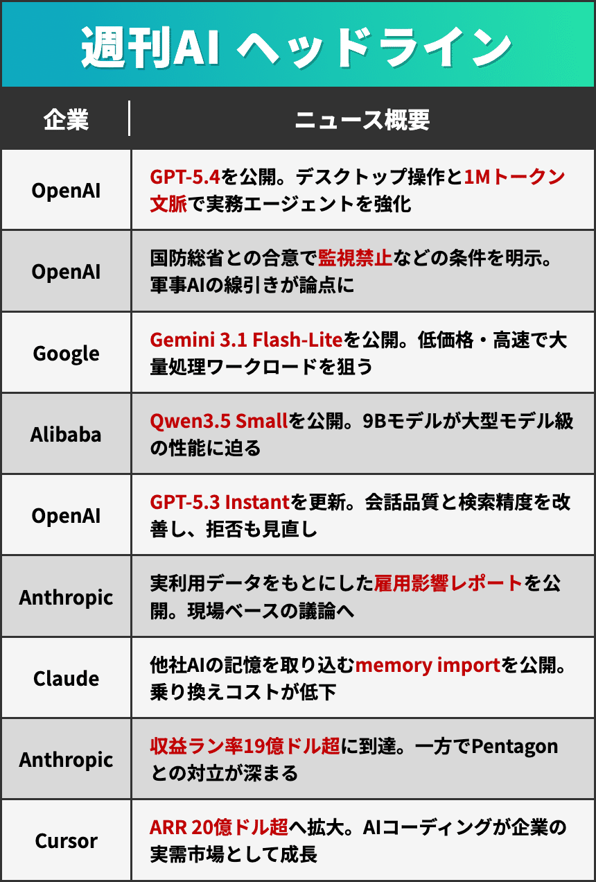 3つ目は、軽量モデルの効率競争です。Gemini 3.1 Flash-LiteやQwen3.5 Smallが示すように、最先端性能だけでなく「どれだけ安く、速く、安定して回せるか」が実運用の主戦場になってきました。
