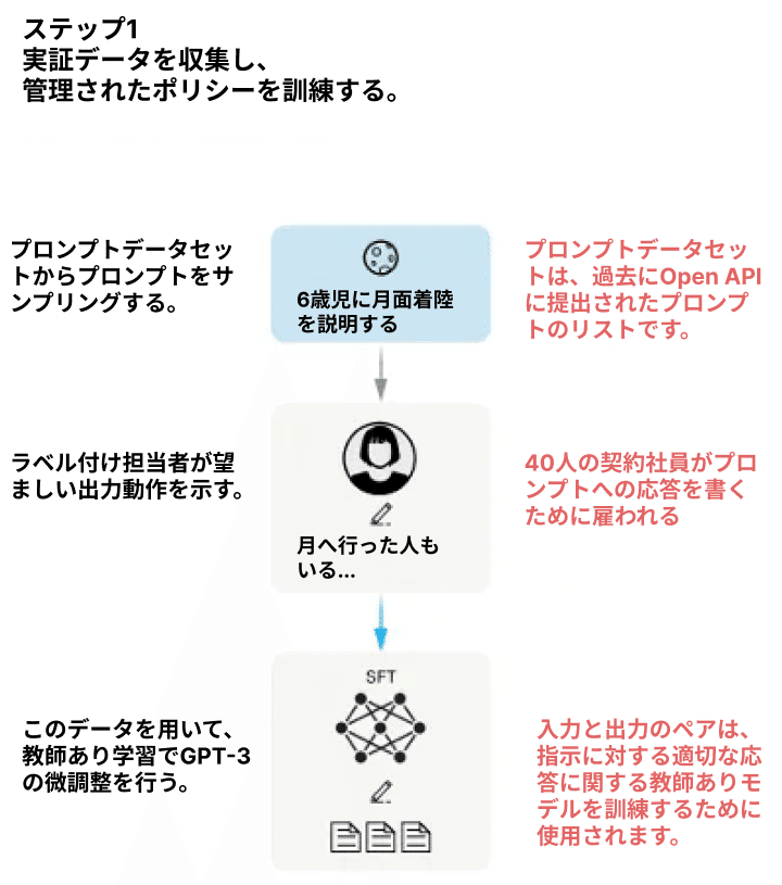 最初の開発では、40人の契約社員を雇い、教師ありトレーニングデータセットを作成することで、GPT-3モデルの微調整を行いました。入力(プロンプト)は、実際にユーザーがOpen APIに入力した内容から収集したもので、その内容をラベリングする。ラベル付け担当者はプロンプトに対して適切なレスポンスを記述し、各入力に対して最適な出力を生成します。その後、この新しい教師ありのデータセットを用いてGPT-3モデルを微調整し、GPT-3.5(SFTモデルとも呼ばれる)を作成した。