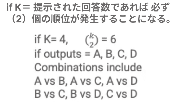報酬モデルを学習するために、ラベル付け担当者には、1つの入力プロンプトに対する4~9個のSFTモデル出力が与えられます。ラベル付け担当者は、これらの出力をベストからワーストにランク付けするよう求められ、以下のような出力ランクの組み合わせを作成します。