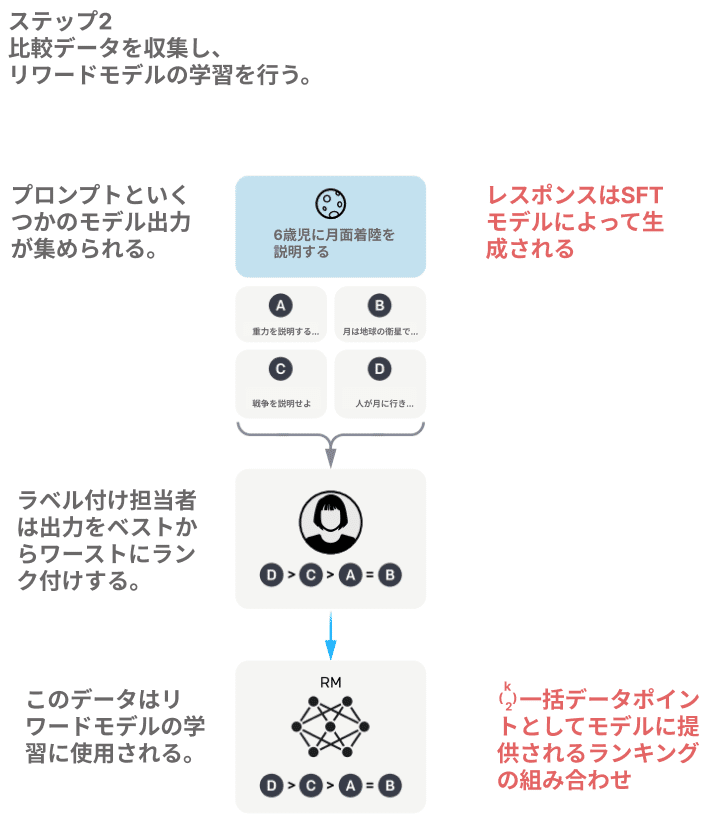 ステップ 1 で SFT モデルを学習した後、このモデルはユーザーのプロンプトに対 して、より適切な応答を生成します。このモデルでは、一連のプロンプトと応答がモデル入力となり、出力はリワードと呼ばれる得点となります。このモデルは、報酬を最大化する出力を生成するように学習する強化学習(ステップ3参照)を利用するために必要です。
