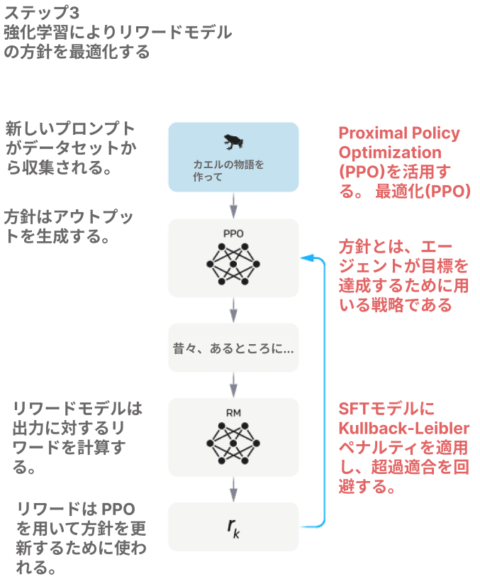 最終段階では,モデルにランダムなプロンプトが提示され,応答が返されます.このレスポンスは、ステップ2で学習した「方針」を用いて生成される。方針とは、機械が目標を達成するために学習した戦略であり、この場合、報酬を最大化することです。ステップ2で開発された報酬モデルに基づいて、プロンプトとレスポンスのペアのための拡張された報酬の値が決定される。その後、報酬はモデルにフィードバックを行い、方針を進化させることができます。