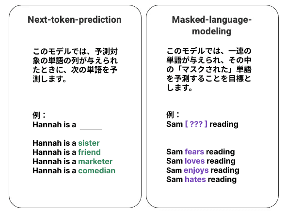 言語モデルの最も基本的な学習方法は、一連の単語の中からある単語を予測することです。最も一般的な学習方法は、次の単語を予測する方法 (next-token-prediction) と隠された単語を予測する方法 (masked-language-modeling) です。