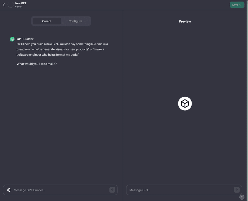 GPT の作成を補助してくれる GPT Builder が立ち上がります。