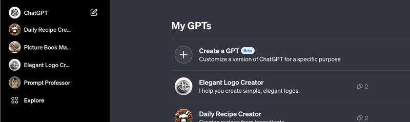 新しい ChatGPT UI の My GPTs のすぐ下、Create a GPT をクリックします。