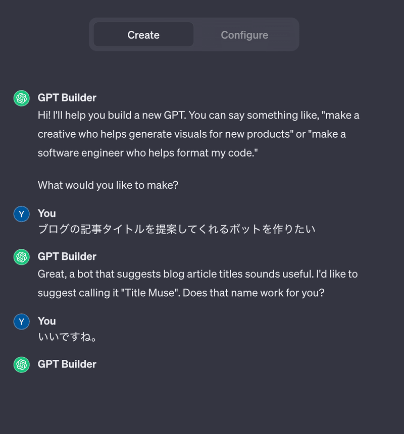 GPT Builder と会話していくだけで、簡単に完成してしまいます。