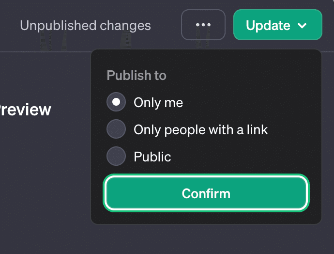 GPT の共有範囲は、右上から、自分だけ、URLを知っている人だけ、パブリックに公開の三つから選ぶことができます。
