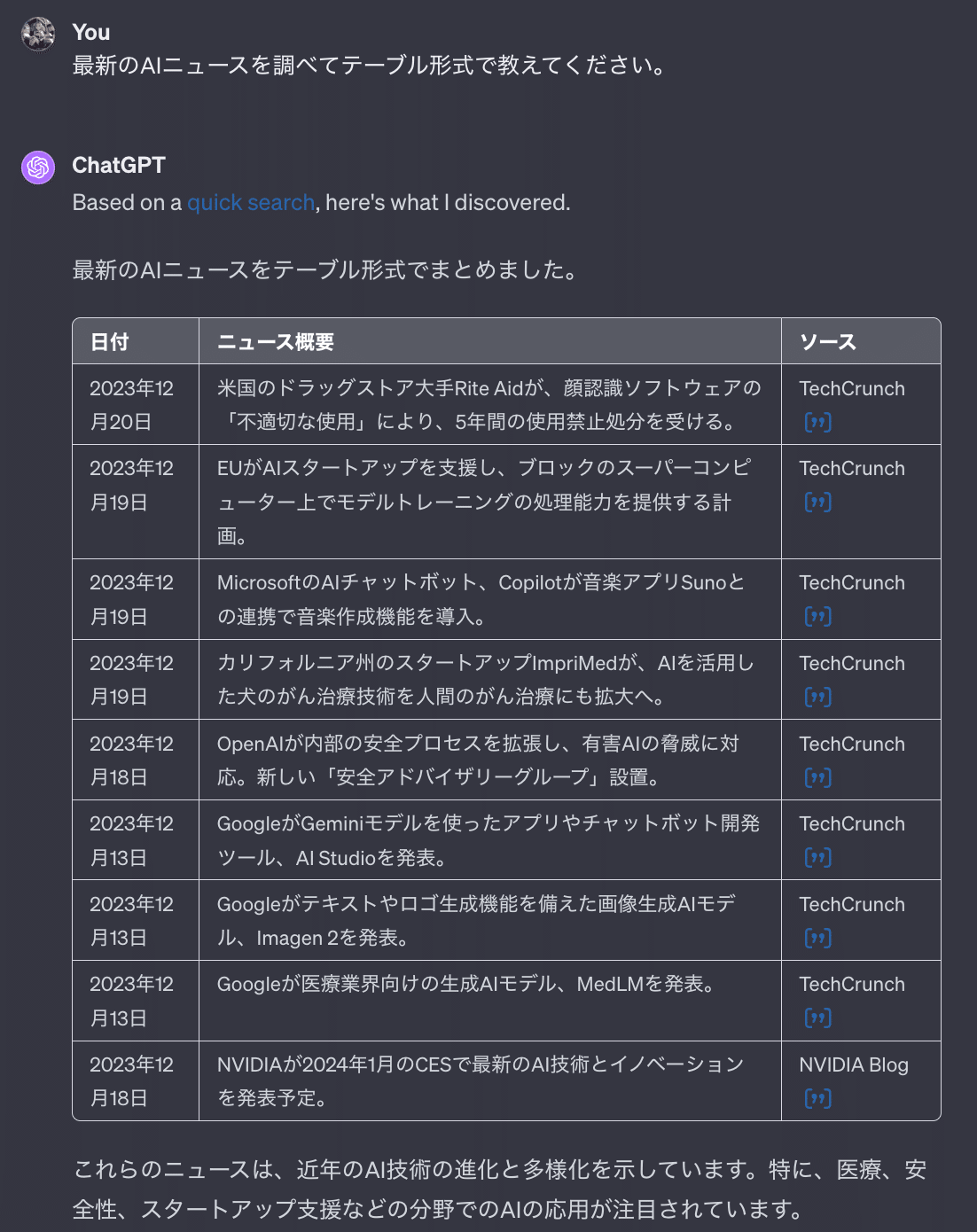 プロンプト: 最新のニュースを調べてテーブル形式で教えてください。