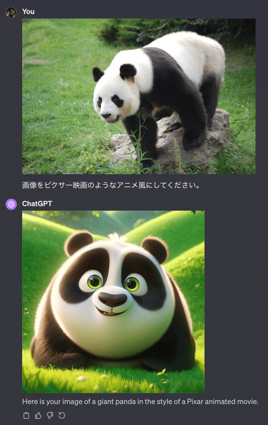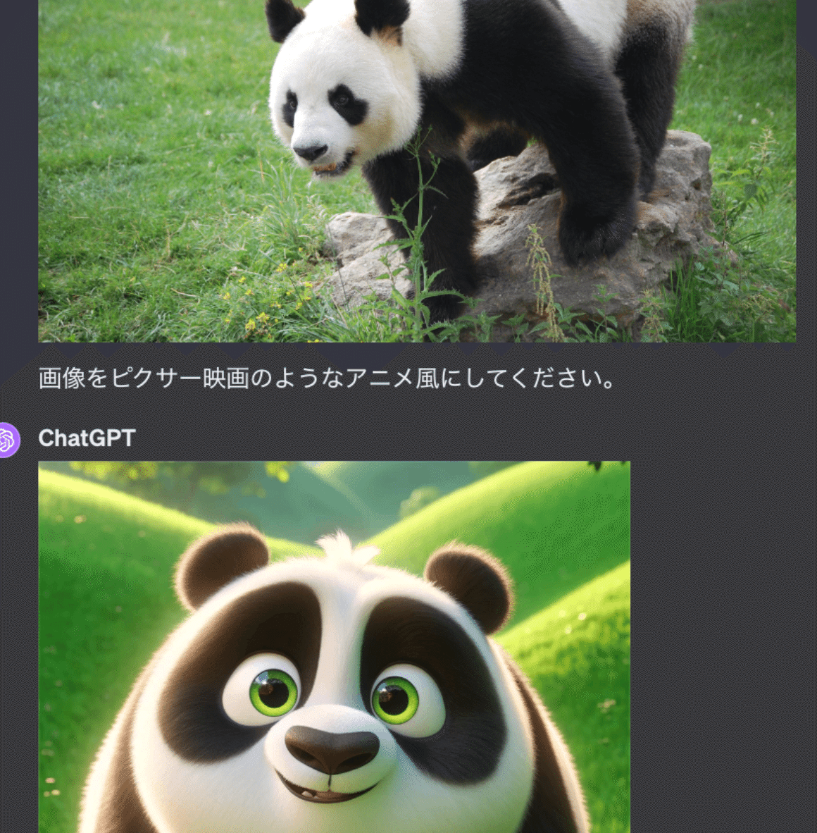 以下のように、パンダの写真からそれをピクサー風のアニメ調に変換してもらうというようなことができます。