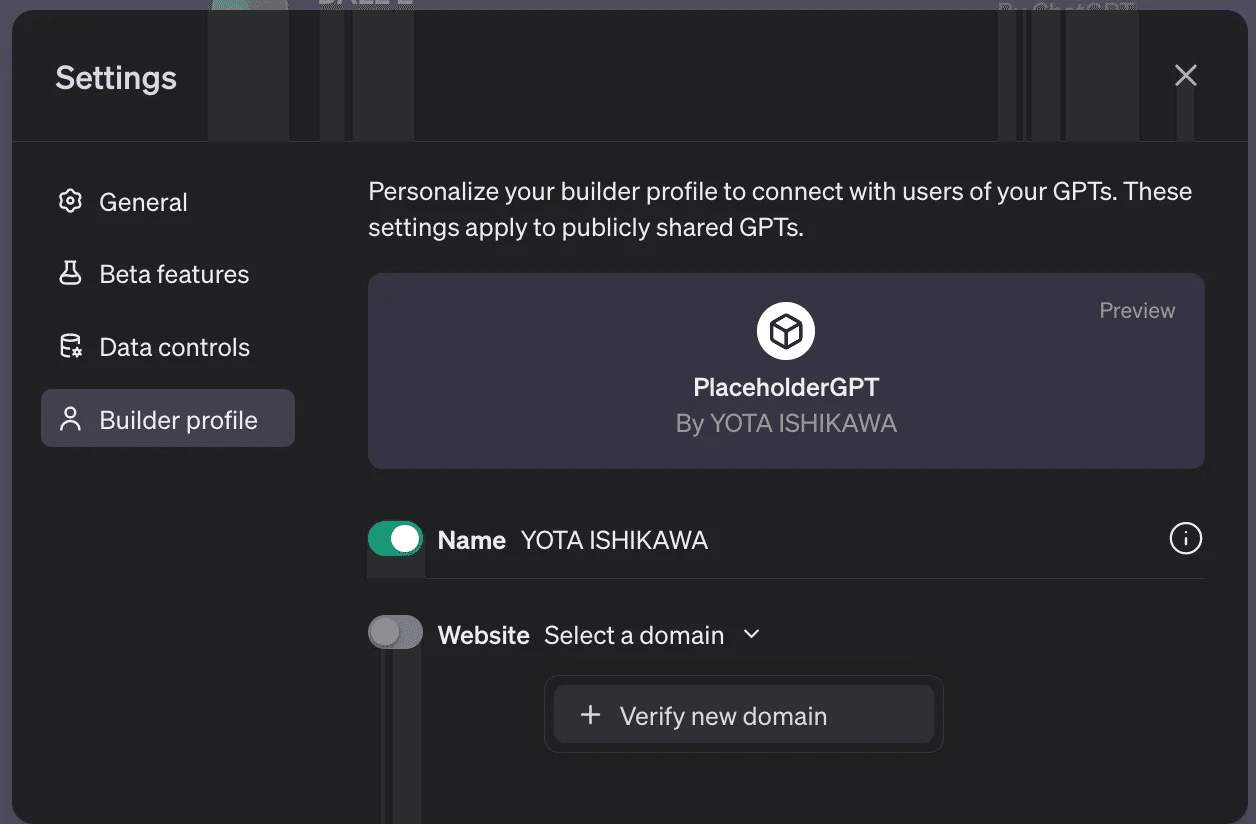 ここでは、GPT Store に出す場合に必須のBuilder Profile の設定方法、特に、自社ドメインの設定方法を見ていきます。