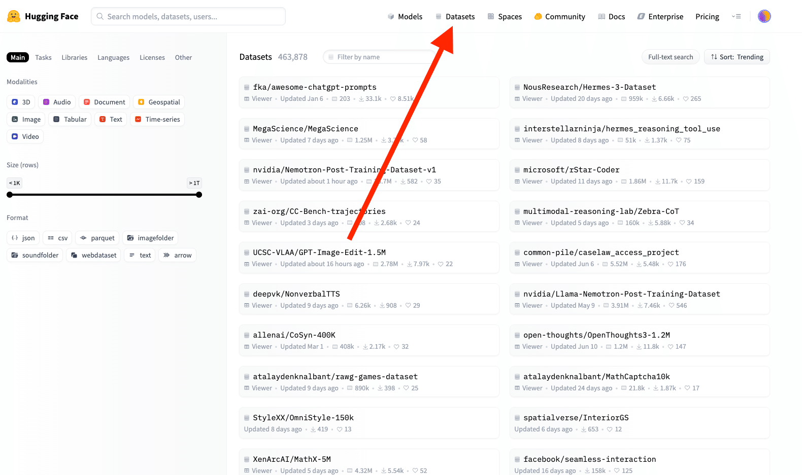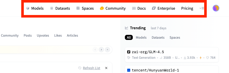 Hugging Face公式サイトの上部メニューには、主要機能として6つのタブが用意されています。