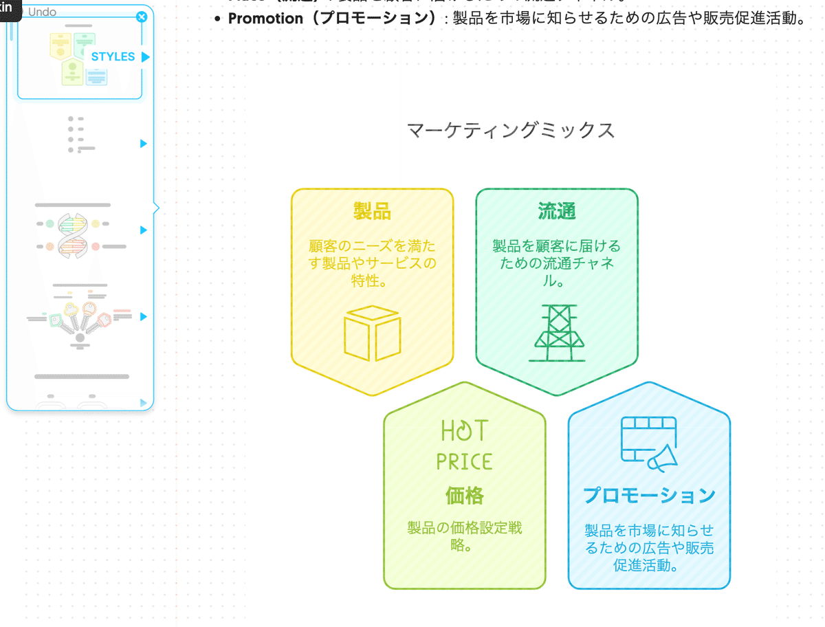 豊富なテンプレート: 図解のテンプレートが豊富で直感的に選べるため、難しいプロンプト不要で使いやすいです。