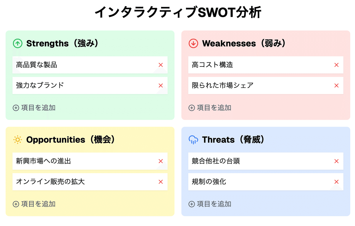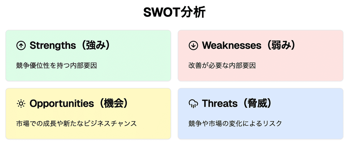 Opportunities(機会): 市場での成長や新たなビジネスチャンス。