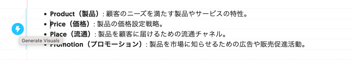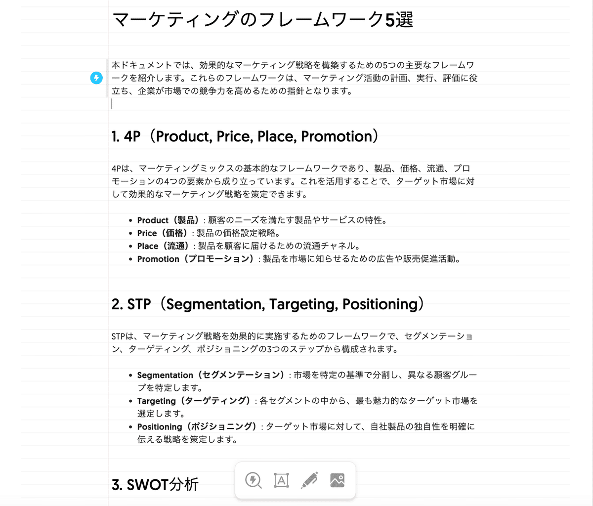 図解生成: ドキュメントの中で、生成ボタン(稲妻マーク)をクリックすると、AIが自動的にテキストを解析し、図解を作成します。