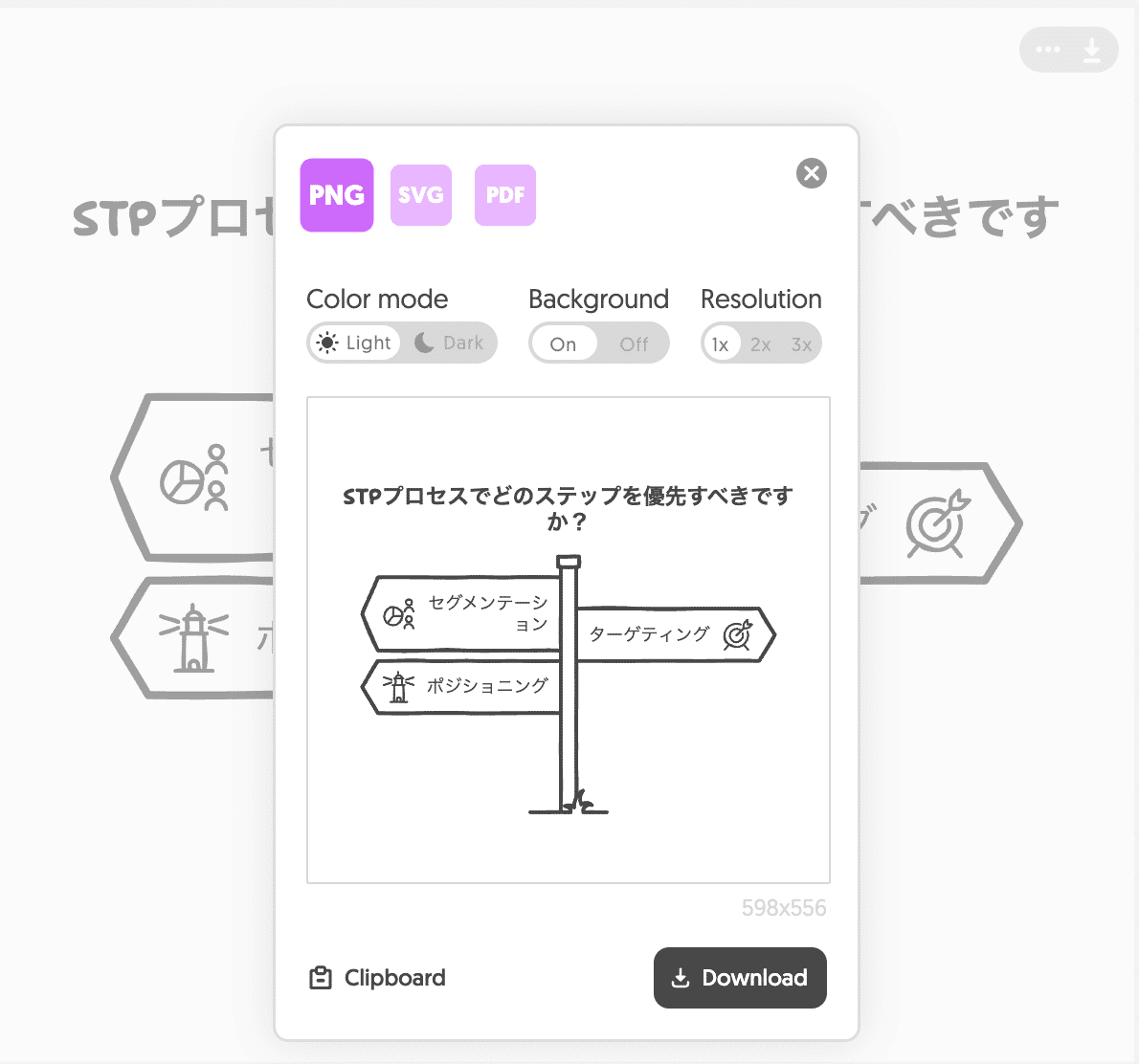 生成された図解は、PNG、SVG、PDFなど、様々な形式で保存できる点も魅力です。