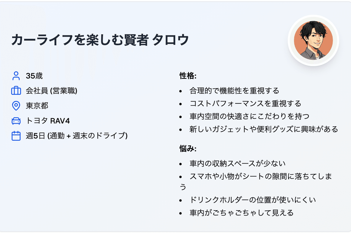 タロウ 年齢: 35歳 職業: 会社員 (営業職) 居住地: 東京都 車種: トヨタ RAV4 運転頻度: 週5日 (通勤 + 週末のドライブ)