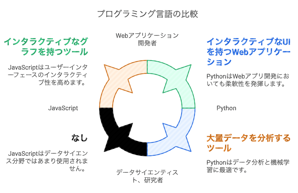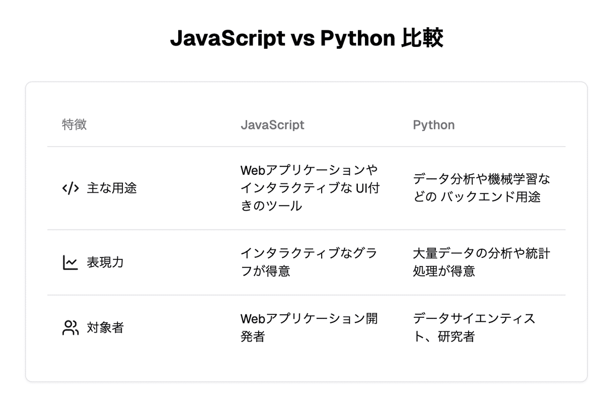 特徴 JavaScript Python 主な用途 WebアプリケーションやインタラクティブなUI付きのツール データ分析や機械学習などのバックエンド用途 表現力 インタラクティブなグラフが得意 大量データの分析や統計処理が得意 対象者 Webアプリケーション開発者 データサイエンティスト、研究者