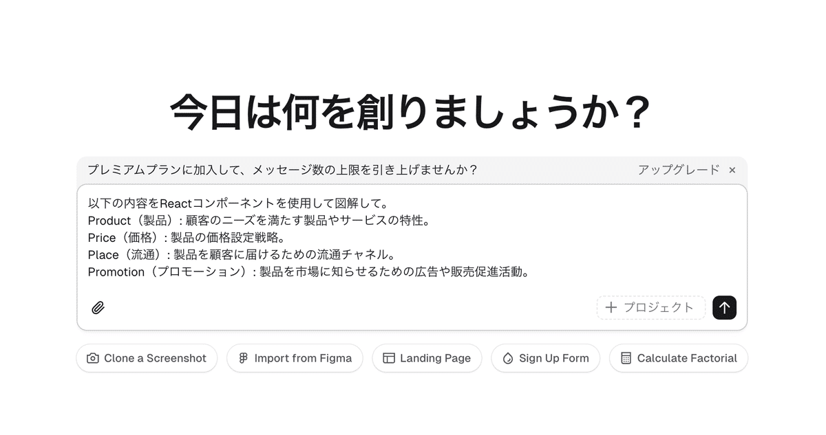 テキストで指示するだけで、WebサイトやアプリケーションのUIデザインを作成できます。v0はReact/Next.jsとの互換性が高く、効率的なプロトタイピングに役立ちます。