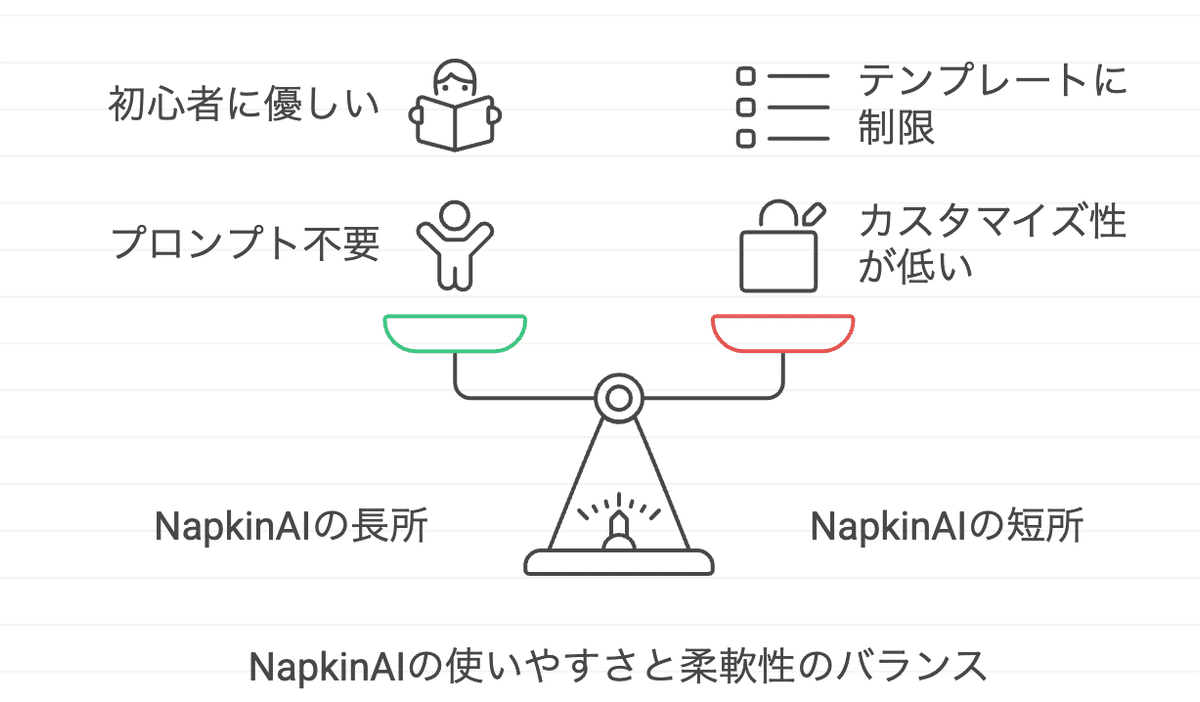 NapkinAIはテンプレートなので、比較表を作って欲しかったのですがテンプレートに当てはめただけの図解になってしまい少しわかりづらいくなりした。