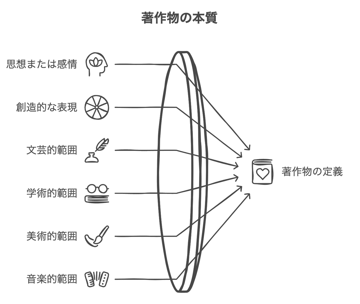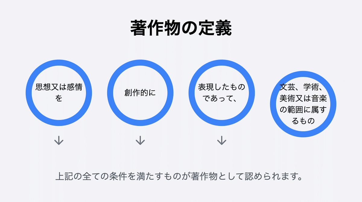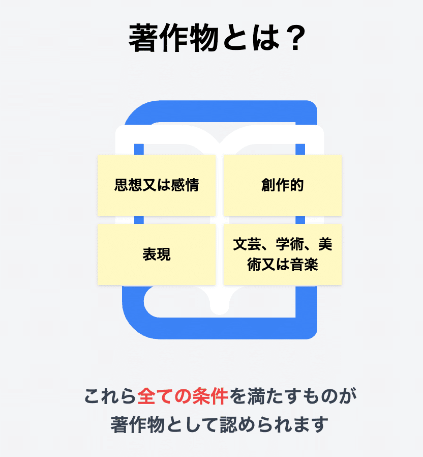 著作物とは以下の条件を満たすものです:思想又は感情を