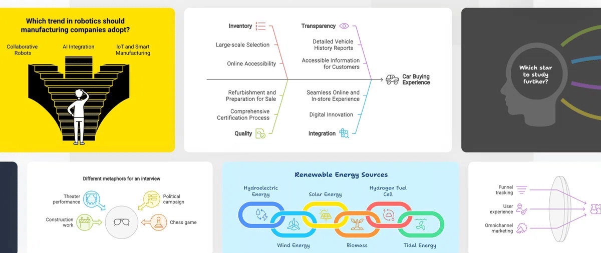 NapkinAIはテキストの内容をAIが解釈して図解を作成するため、フローチャートやマインドマップ、概念図など、様々な種類の図解を作成できます。