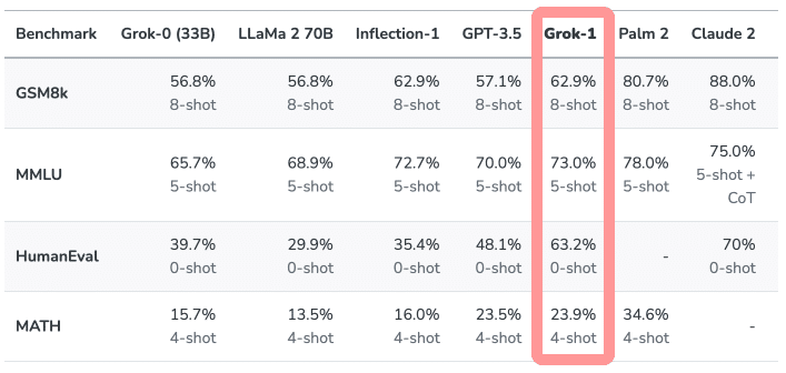 また、2023年のハンガリー国立高等学校(Hungarian national high school)最終試験の数学問題に対する評価でも、Grok-1は59%というスコアを得ています(Claude-2は55%、GPT-4は68%でした。すべてのモデルはtemperature 0.1、同じプロンプトで評価された)。これは、Grok-1が実際の試験問題に対しても一定の能力を持っていることを示しています。
