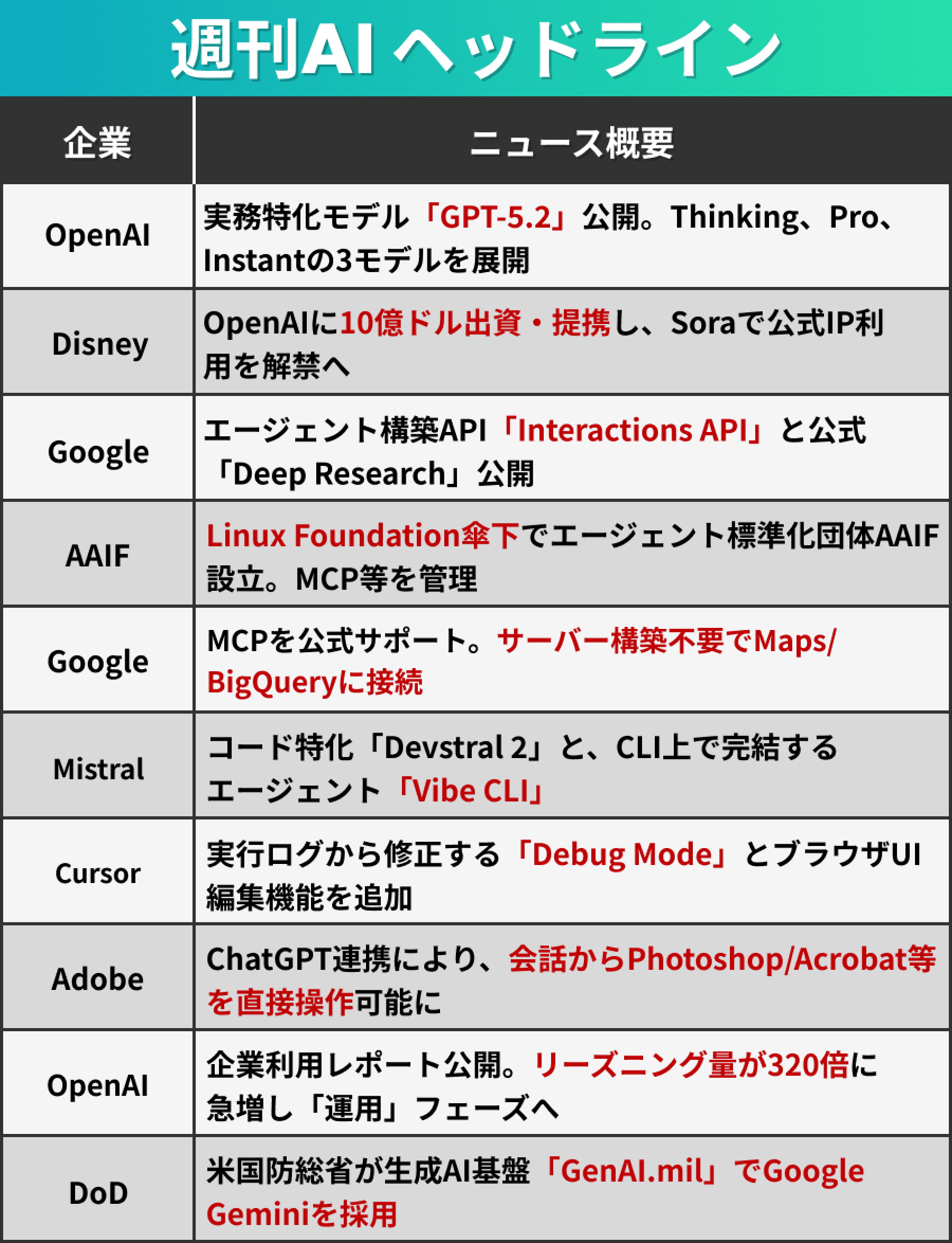 今週は、創業10周年を迎えたOpenAIが「GPT-5.2」を電撃投入し、話題を一身に集めました。