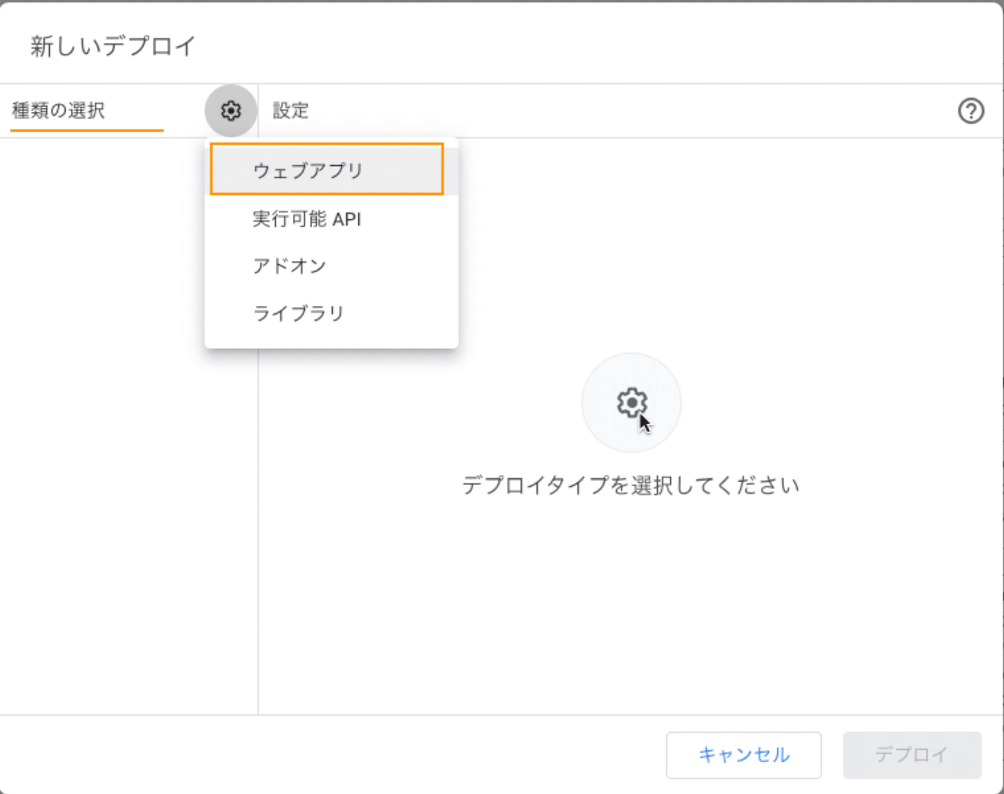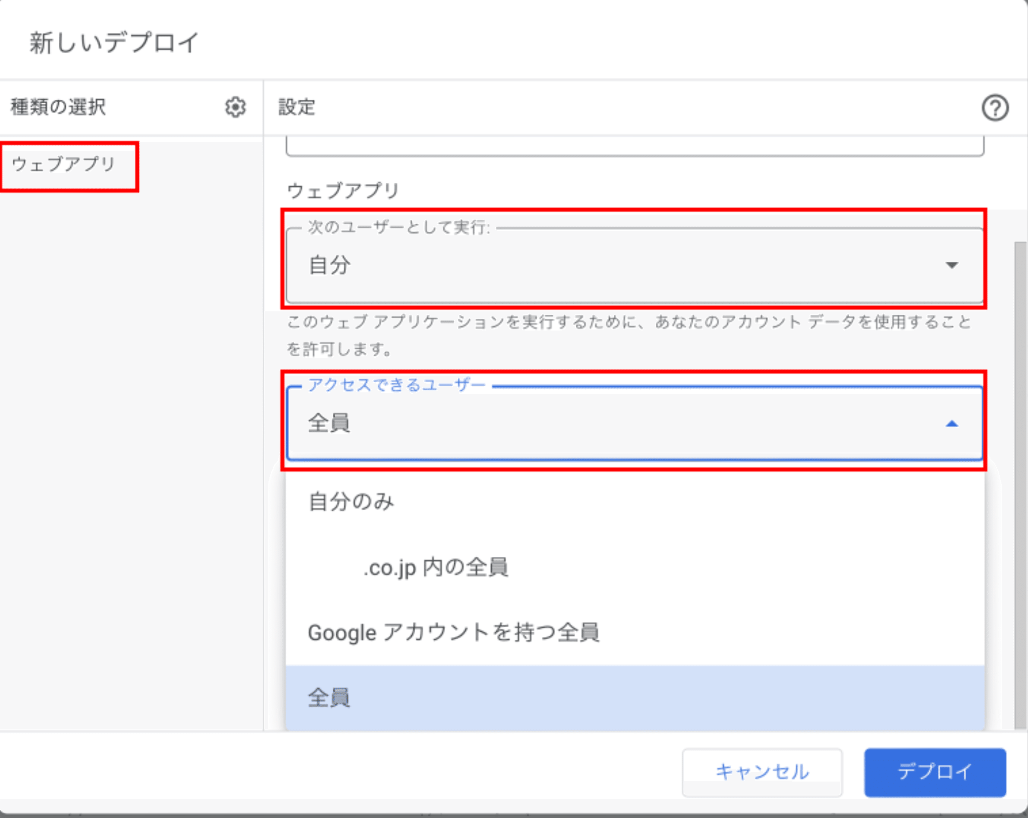 「種類の選択」で「ウェブアプリ」 を選択後、