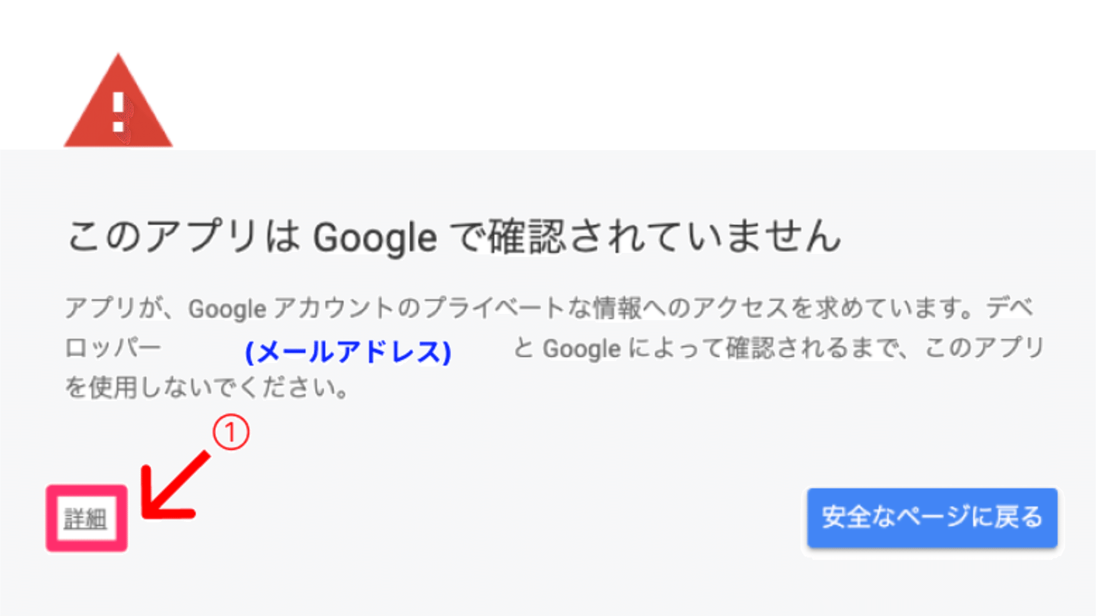 備考)エンタープライズアカウント以外では、次の画面で以下のように、「このアプリはGoogleで確認されていません」という画面が出る場合があります。