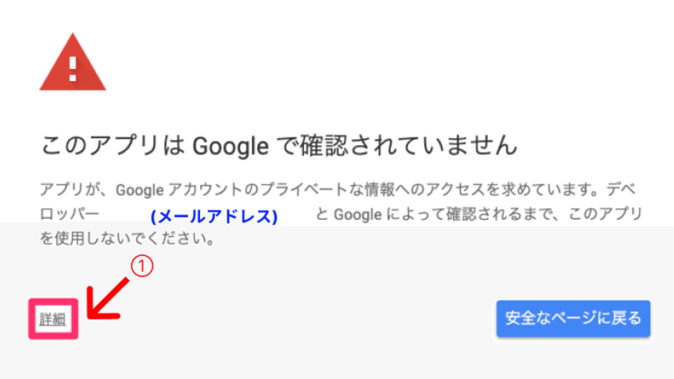 • 備考)エンタープライズアカウント以外では、次の画面で以下のように、「このアプリはGoogleで確認されていません」という画面が出る場合があります。