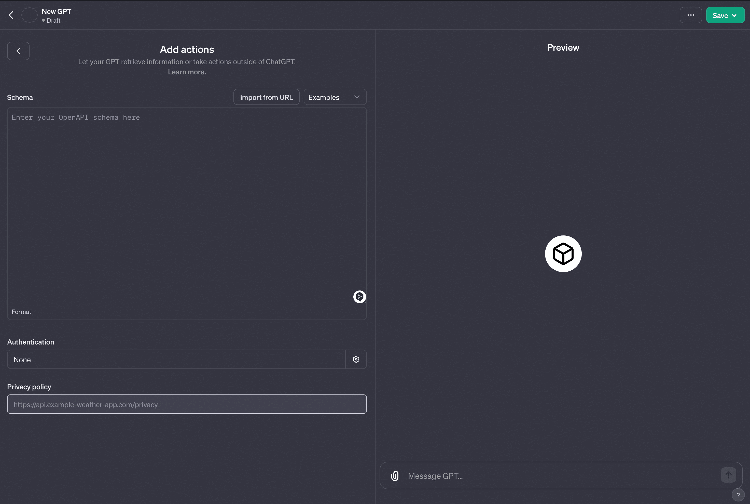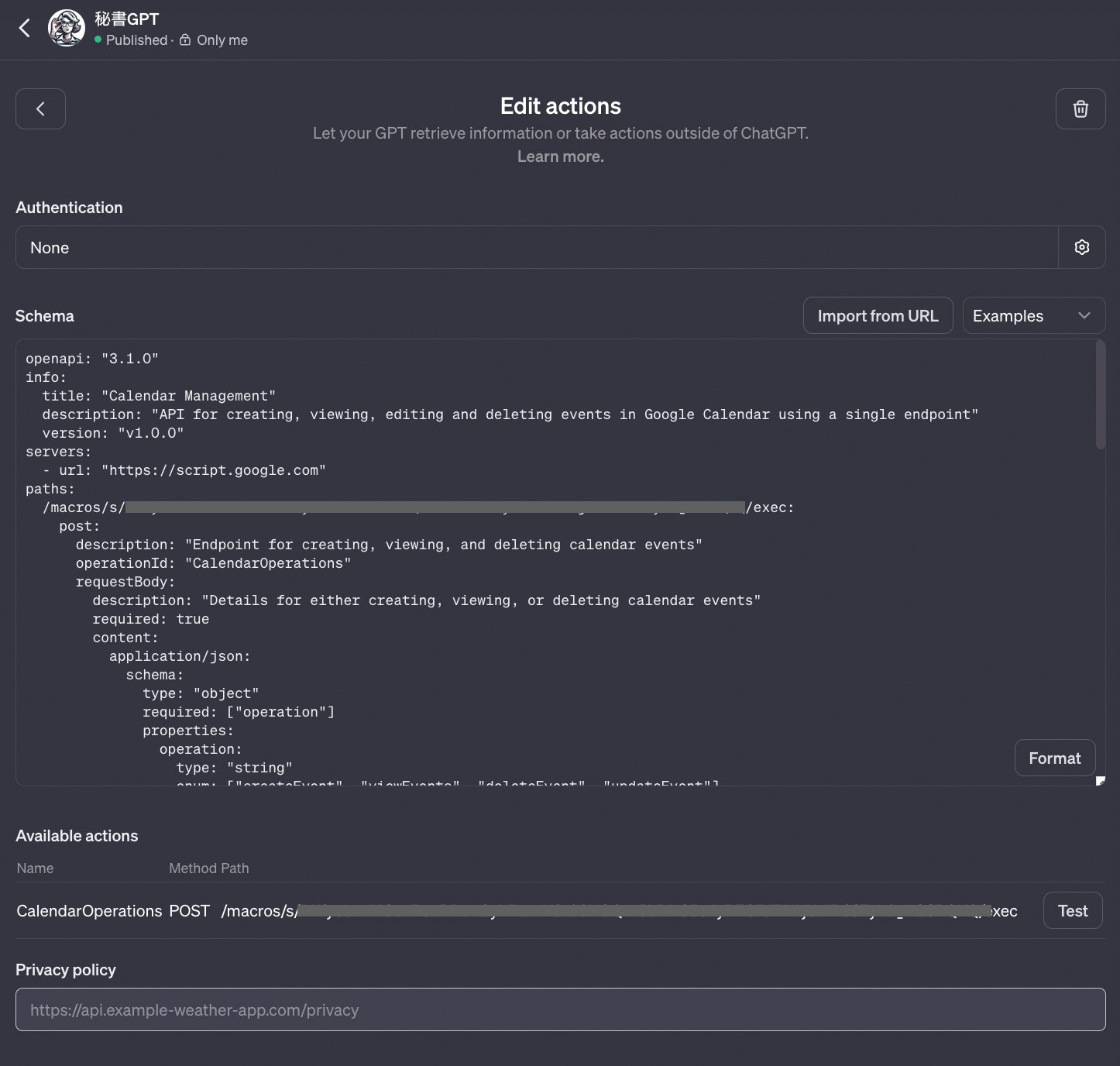 注意点として、このGPTは必ず、Only me でのみ利用するように注意してください。他の人に使ってもらうものではありません。(※そもそも Privacy Policy URL を入力していないためURLを共有することは物理的にできません)